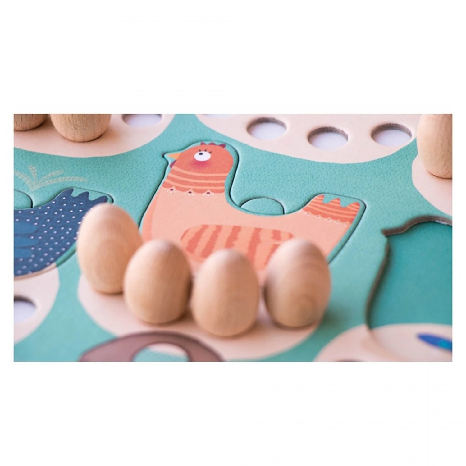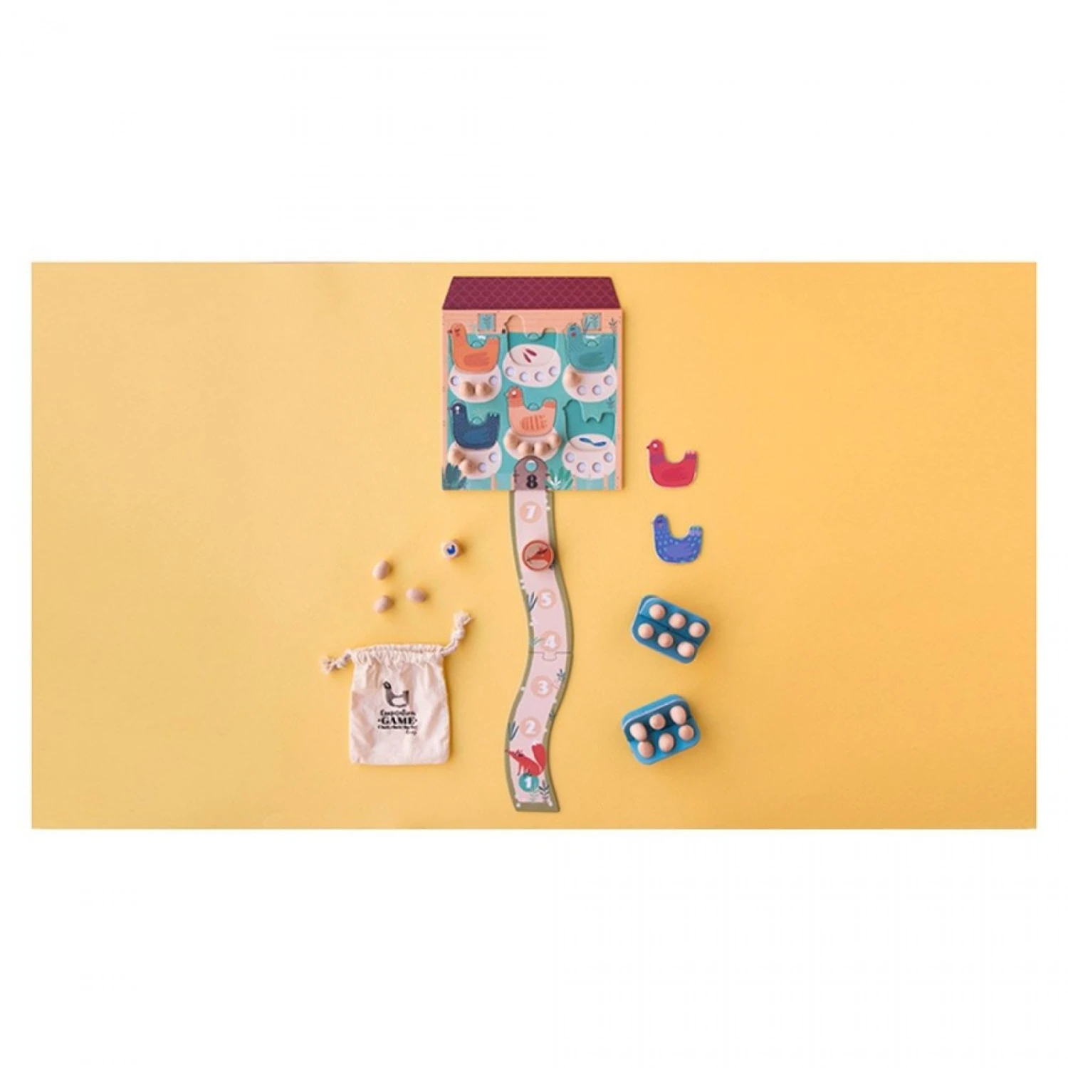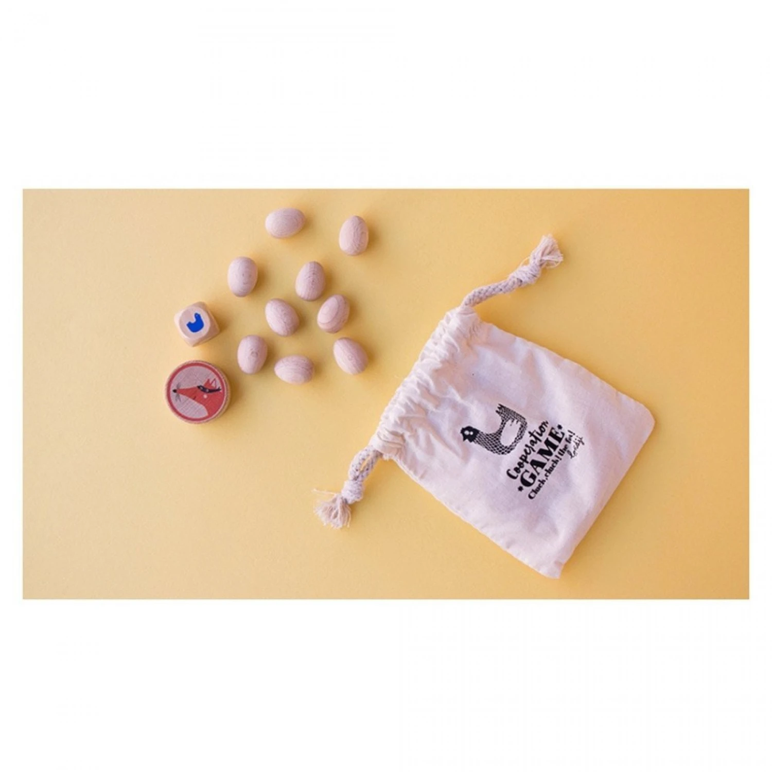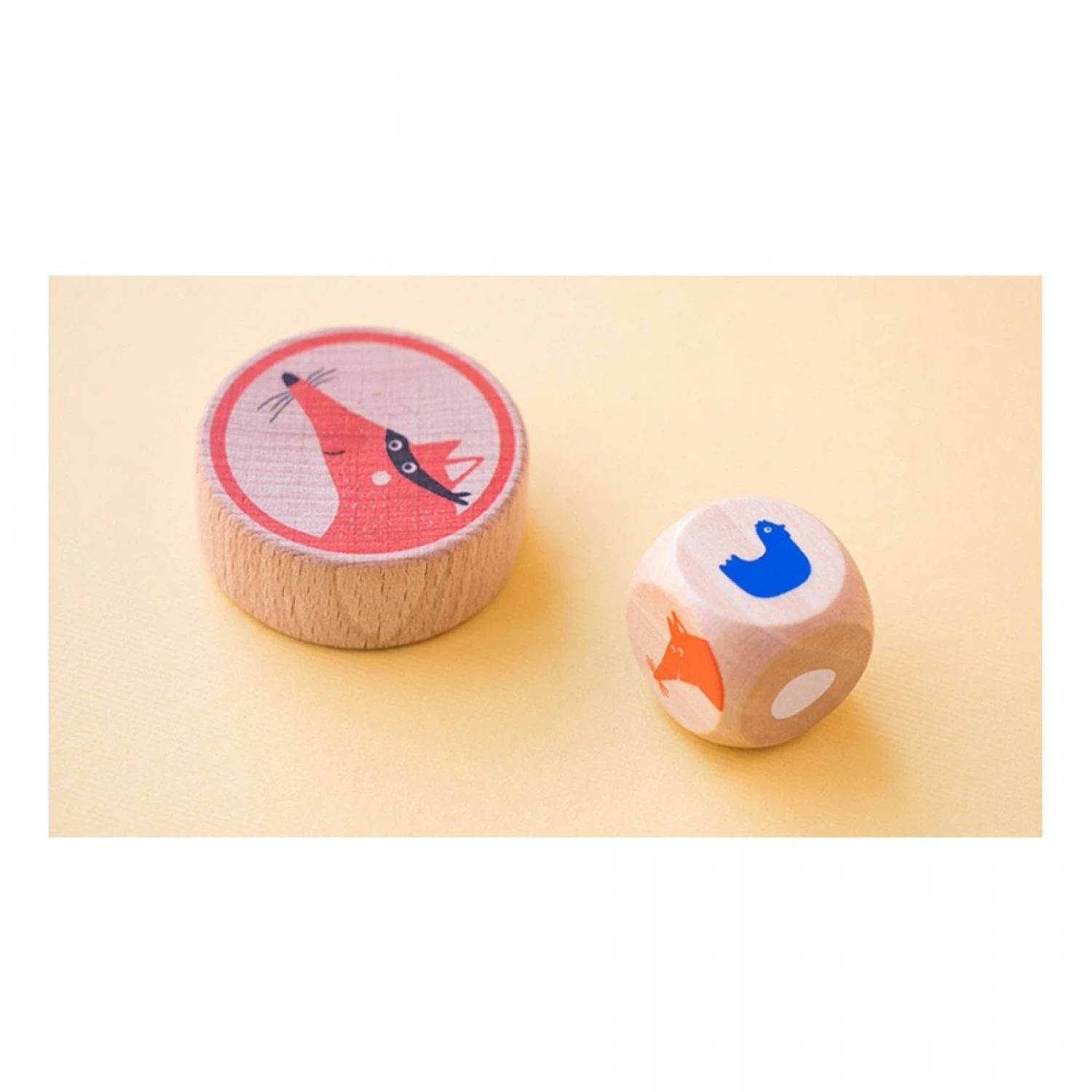 Règle du jeu : Placez 4 oeufs dans chaque nid, placez une poule sur chacun des nids et le renard sur la case départ. Le premier joueur lance le dé. En fonction des indications du dé, réaliser l’action demandée : prendre un oeuf et le placer dans une boîte à oeufs, prendre une poule ou avancer le renard….Les joueurs remportent la partie si tous les oeufs et les poules sont à l’extérieur du poulailler avant que le renard n’arrive à la case 8. Si le renard arrive au poulailler et qu’il reste encore des oeufs, c’est le renard qui remporte la partie.