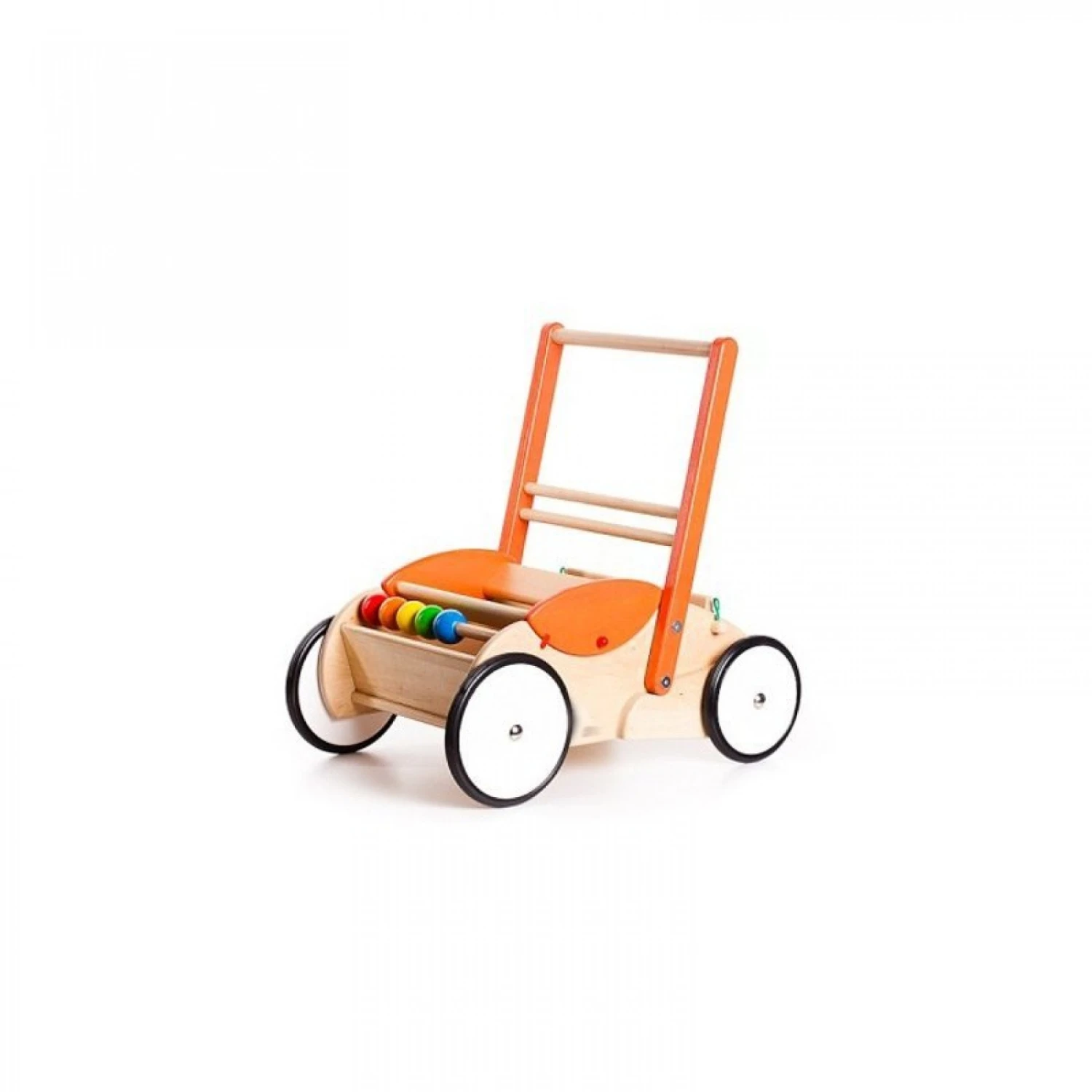 Ce chariot de marche se transforme rapidement en poussette pour poupée en relevant le plateau intérieur. Avec boulier intégré.