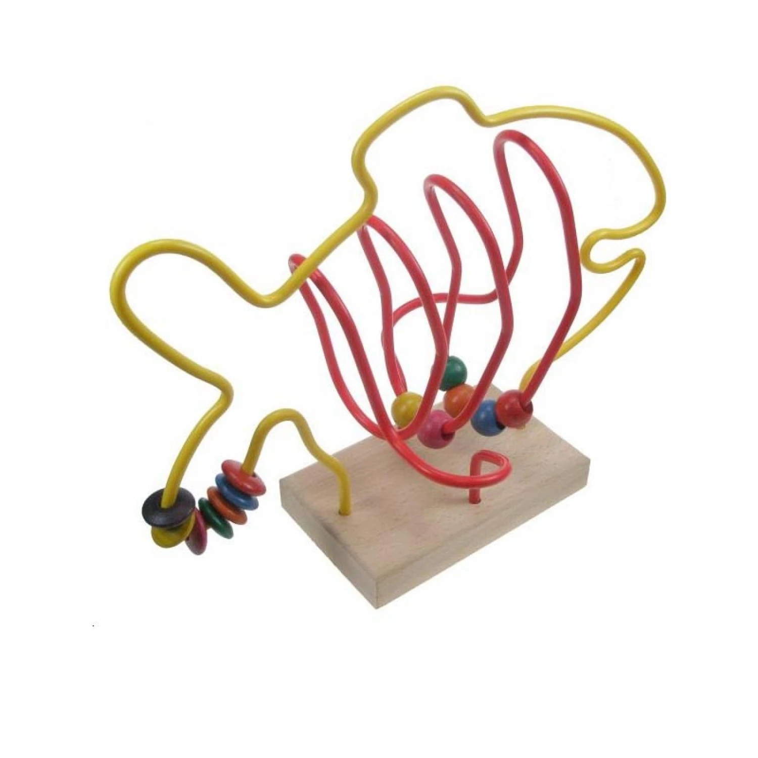 Son grand socle en bois accueille deux tiges en plastique de couleur rouge et jaune (de qualité alimentaire) sur lesquelles glissent 7 perles et 7 anneaux colorés.