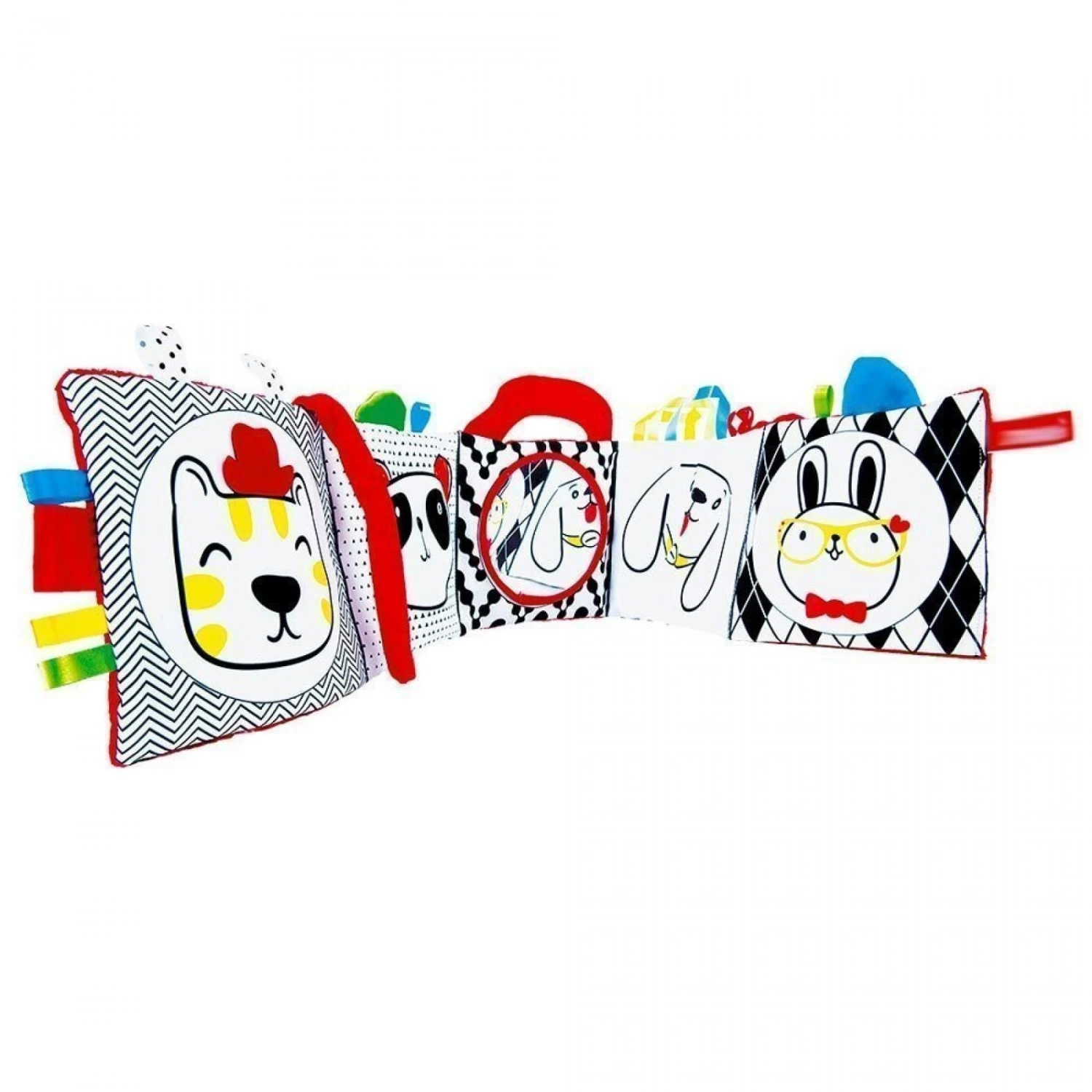 Un grand livre sensoriel en tissu avec des pages bruissantes. Un côté du livre est imprimé en rouge, noir et blanc et l’autre face comprend un miroir ainsi que des pages avec des têtes d’animaux. Une combinaison de dessins et de couleurs stimulant l’éveil des sens de bébé.