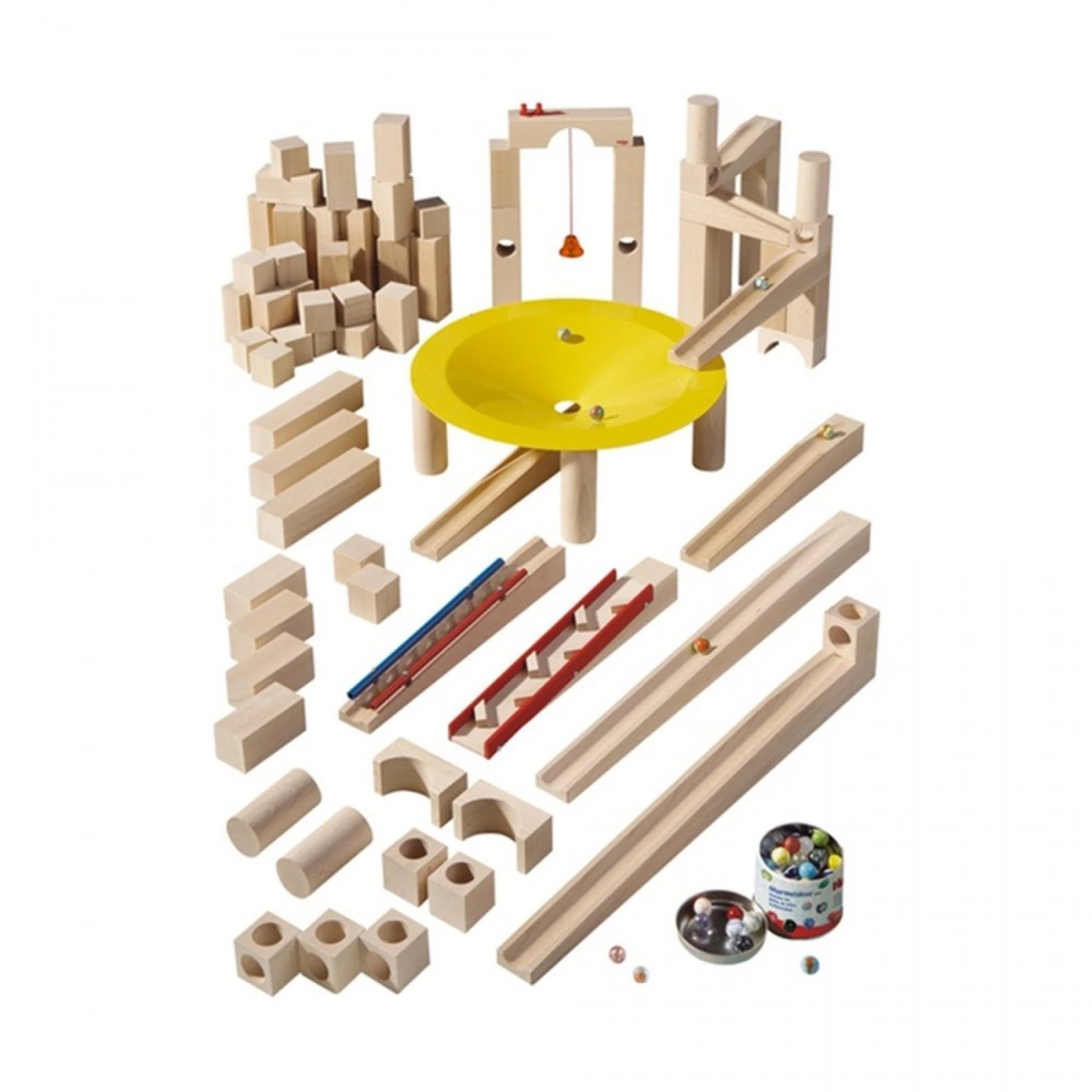 Un toboggan à billes très complet, permettant de nombreuses possibilités de parcours. Ce coffret « géant » contient de nombreux blocs en bois de hêtre massif ainsi que des billes en verre.
