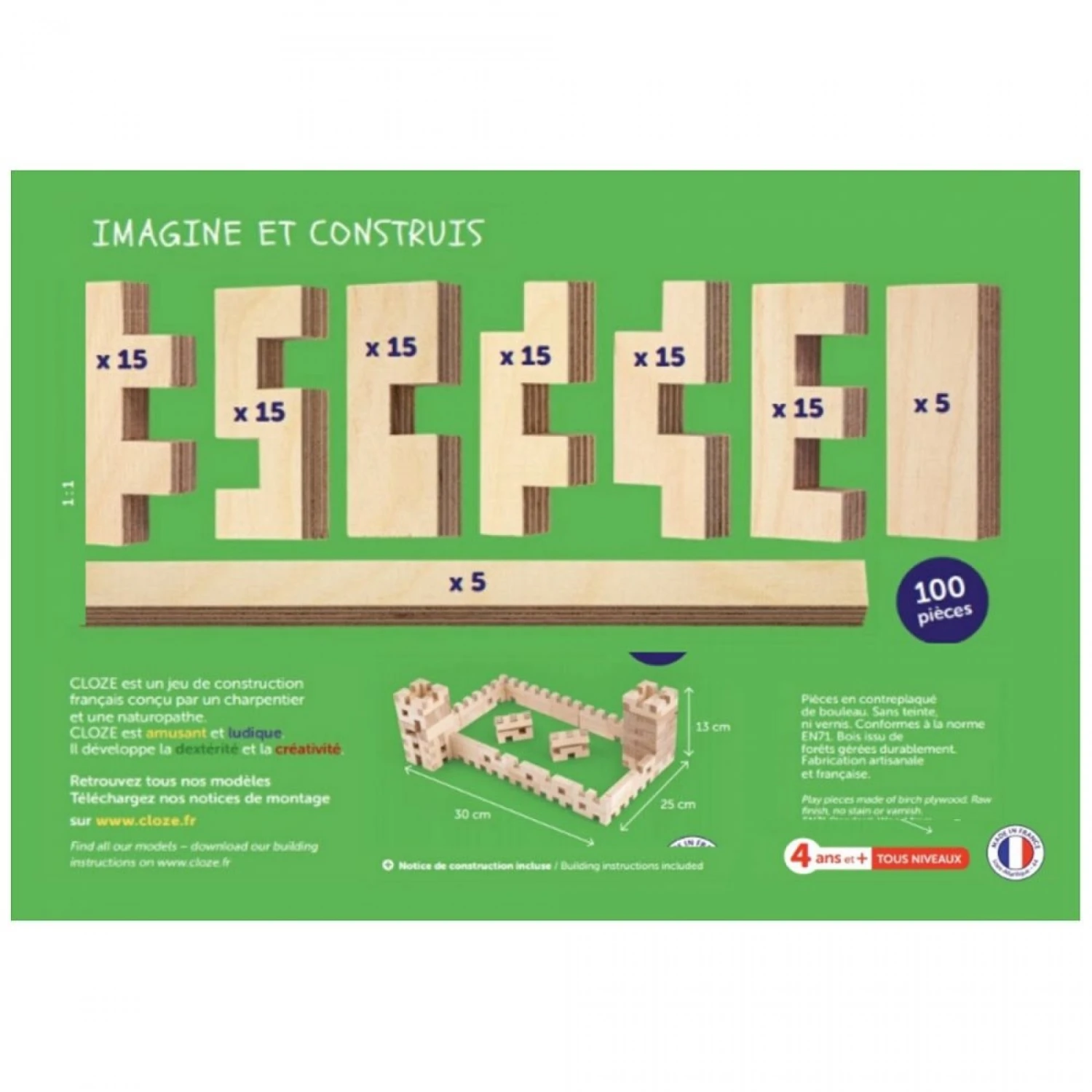 CLOZE est un jeu de construction pour s’amuser en 2D, type puzzle ou labyrinthe ou en 3D, afin de développer ses capacités de repérage dans l’espace. Avec les pièces en bois, votre enfant pourra réaliser ses propres créations originales et architecturales en développant son imaginaire : chateau fort, dinosaure…