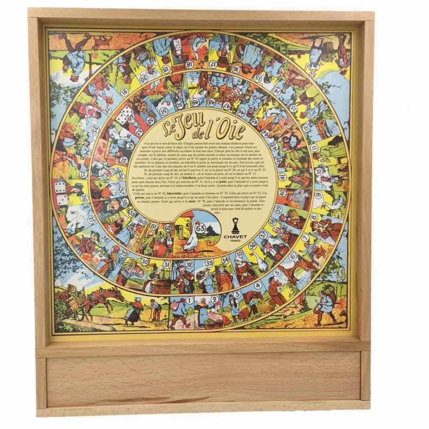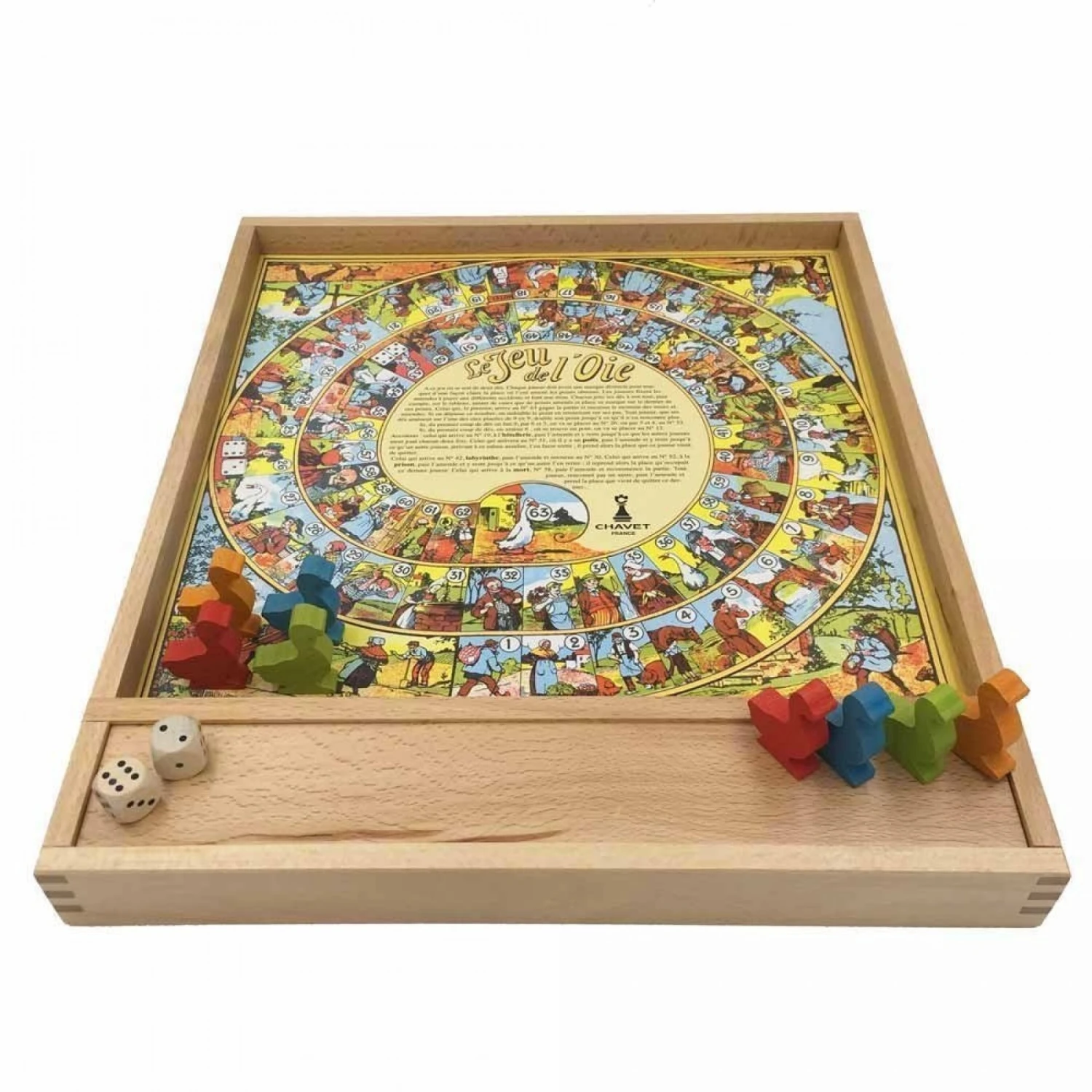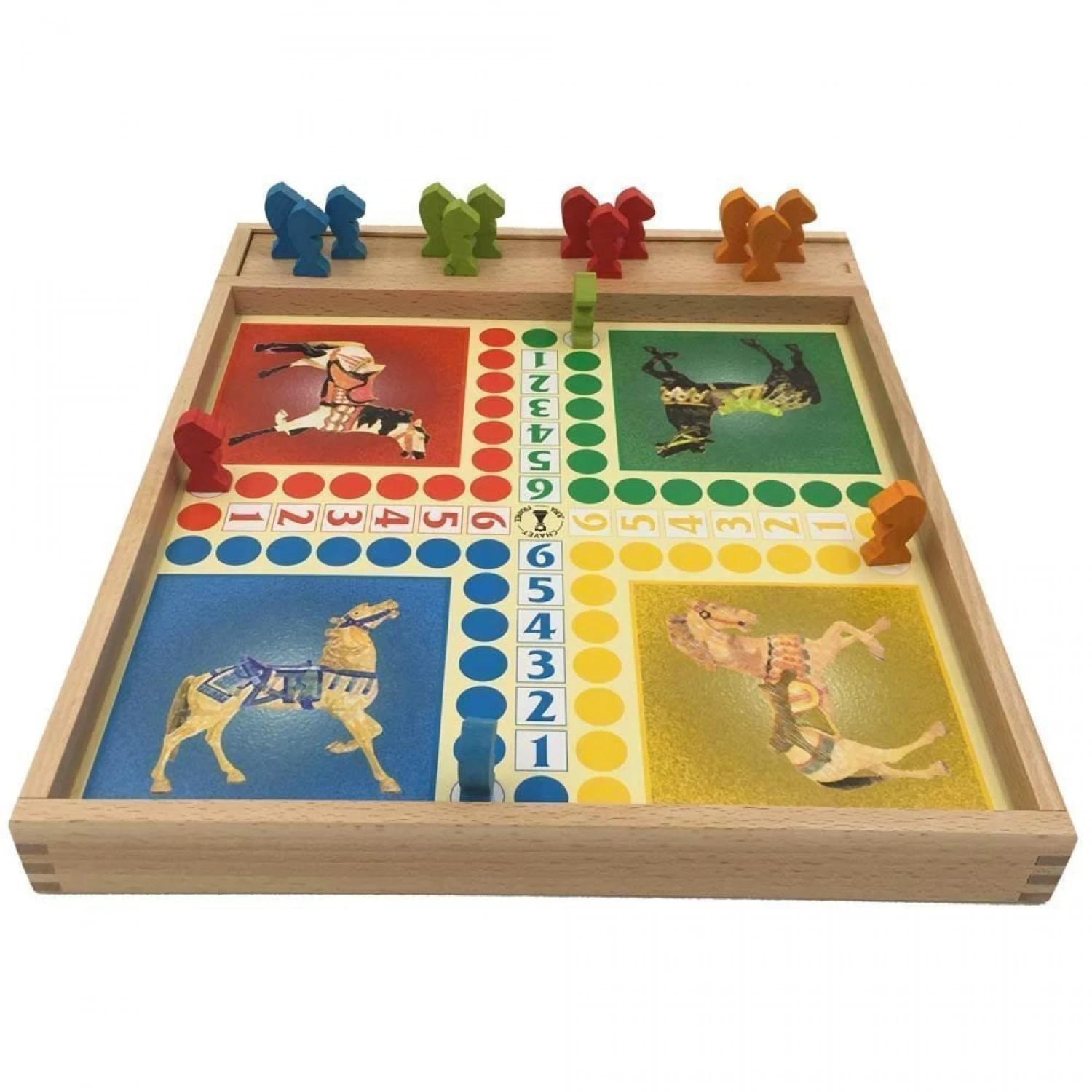 Un plateau composé au recto d’un jeu de petits chevaux et au verso d’un jeu de l’oie. Deux jeux en bois traditionnels regroupés sur un même plateau. Les jetons en bois se rangent astucieusement dans le plumier se trouvant à l’extrémité du plateau de jeu.