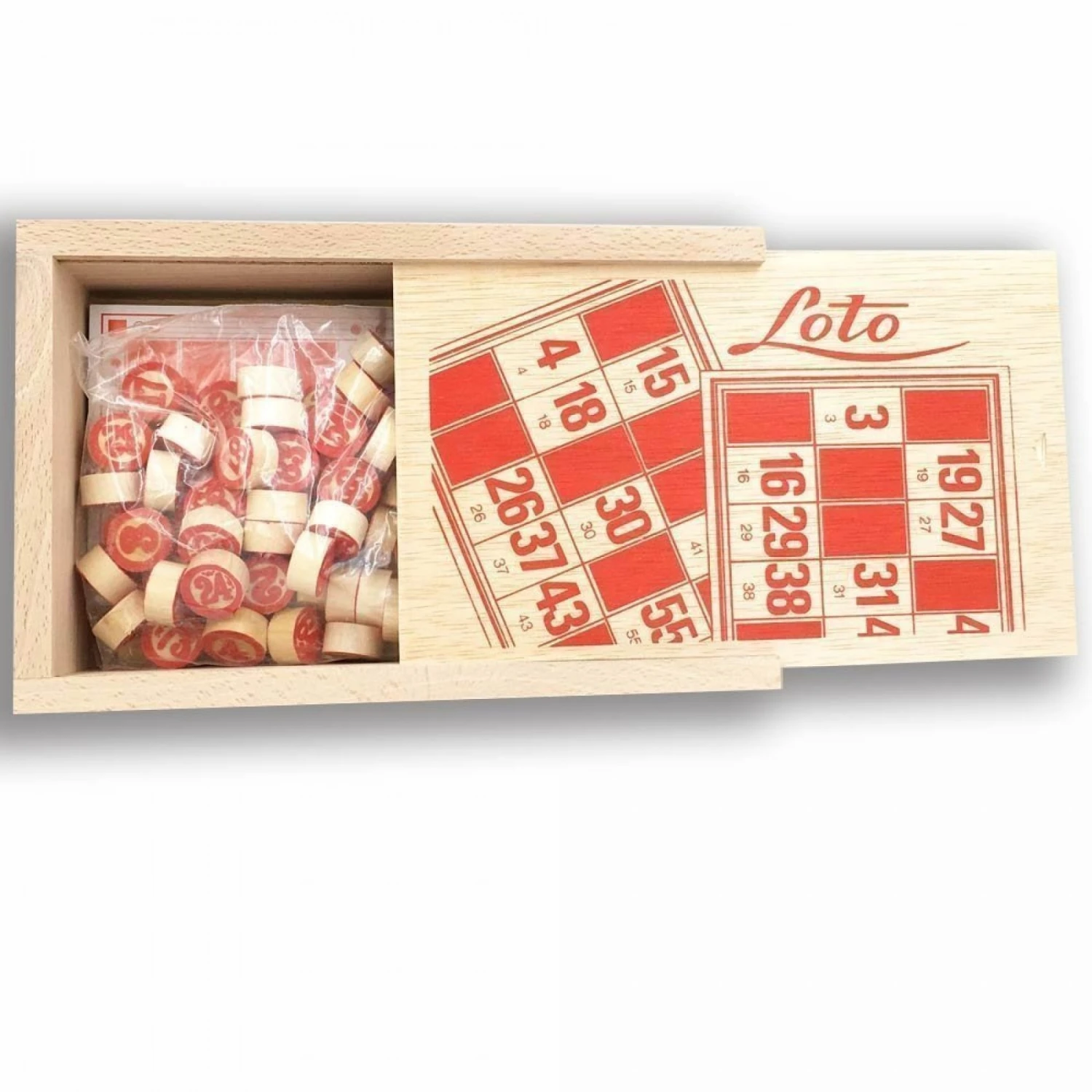Une boîte contenant 24 cartes et 50 jetons en bois, pour jouer au loto. Des pions en bois numérotés, à tirer au hasard pour compléter ses cartes le premier.