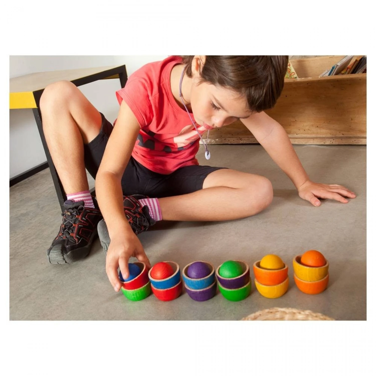 Un jeu en bois développant la logique mathématique en classifiant, regroupant les éléments en fonction de leur forme et/ou de leur couleur. Pour les plus jeunes, le bol peut être utilisé par exemple comme une cachette en faisant apparaître et disparaître la boule ou en entrechoquant les boules.