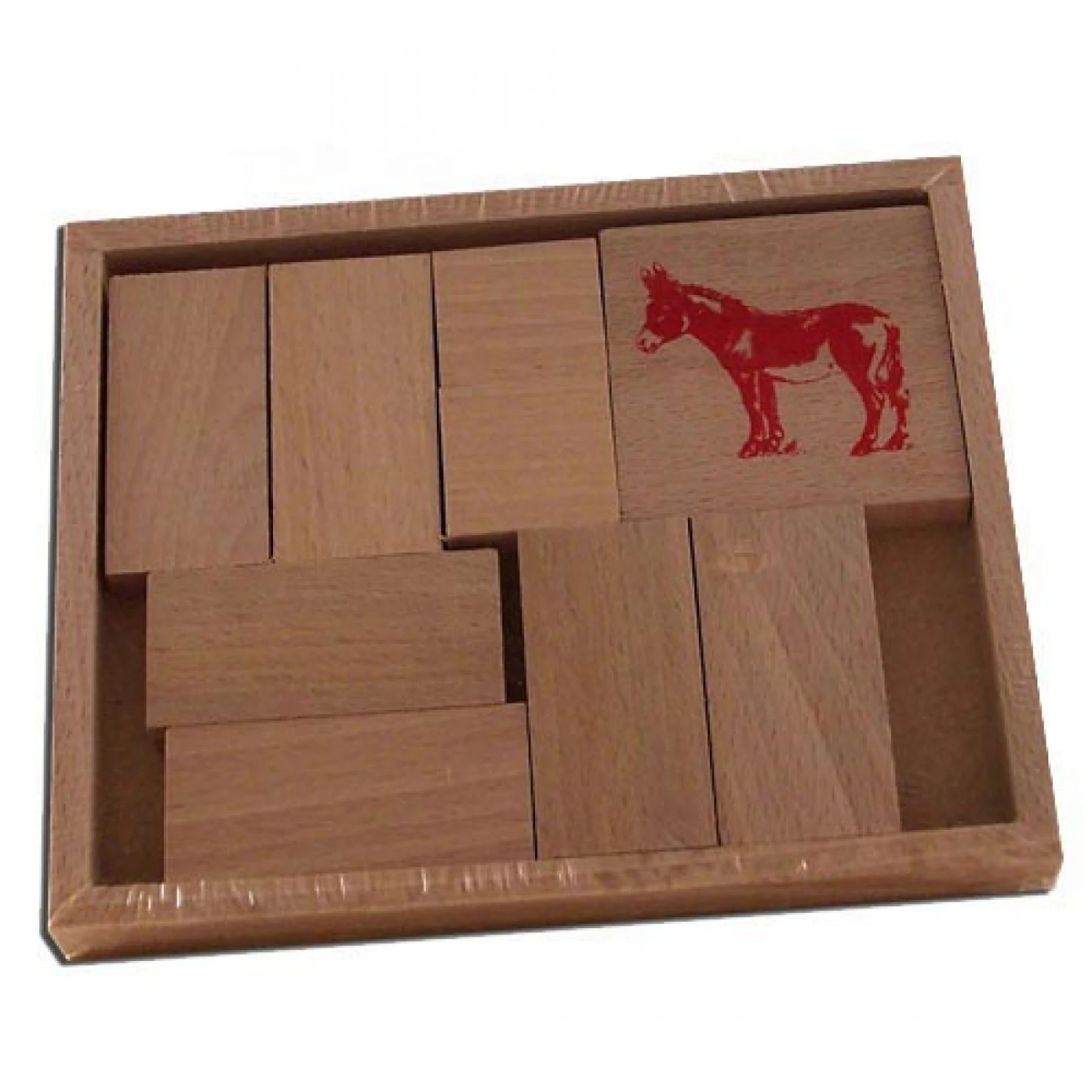 Le jeu consiste a faire passer l’âne rouge dans le coin inférieur gauche, sans sortir aucun élément du boitier.