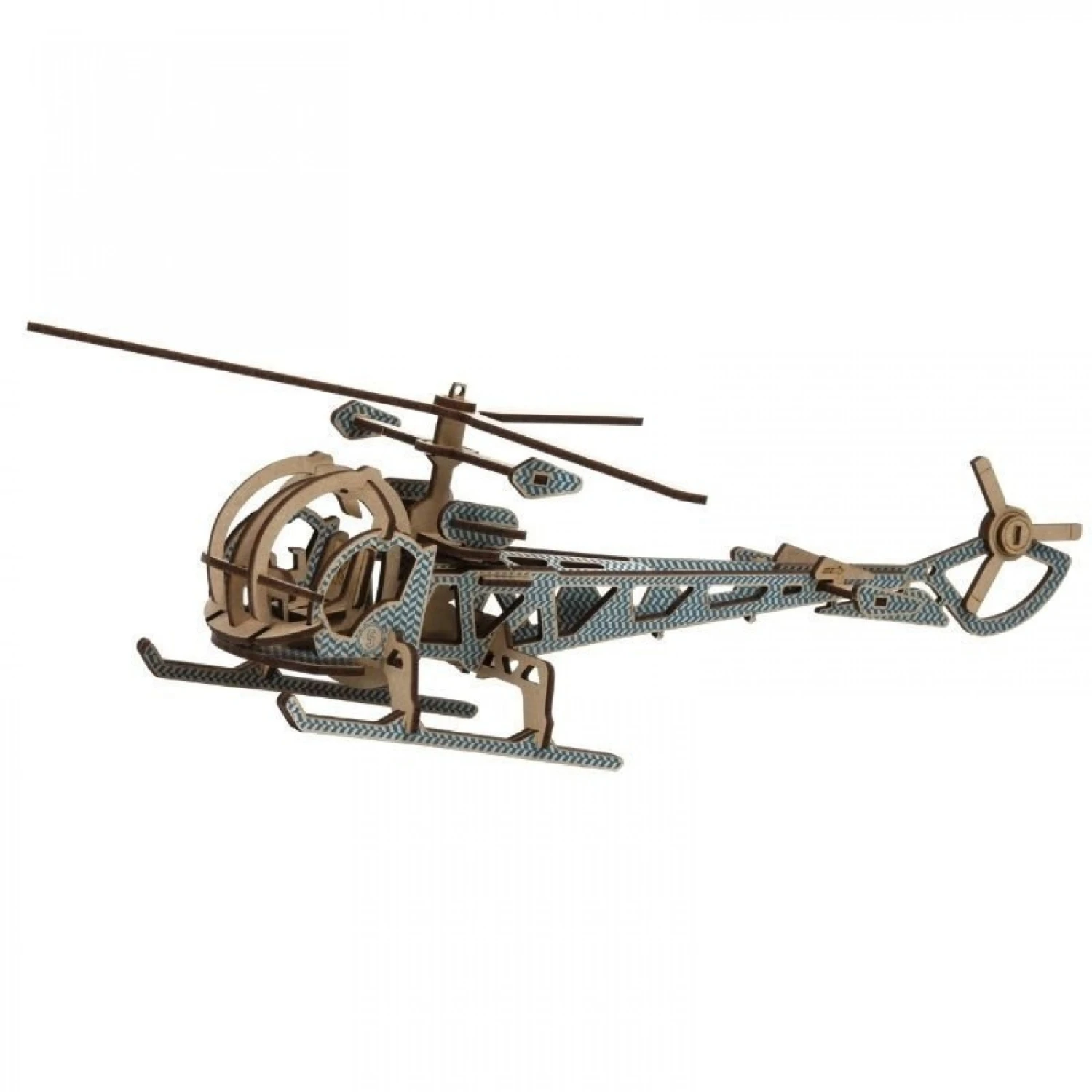 Retrouvez la maquette Hélicoptère en couleur : bleu, rouge et bois.