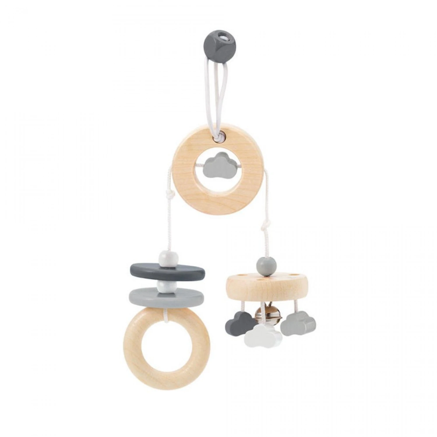 Un mini-mobile qui s’adapte facilement et en toute sécurité sur un transat, un siège auto, un portique d’activités…Un jouet d’éveil en bois conçu pour divertir bébé lors des promenades et à la maison.