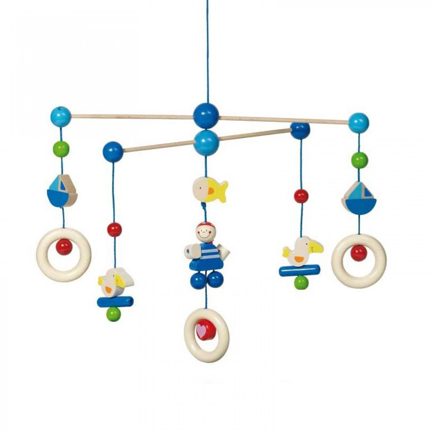 Un mobile en bois avec un petit pirate inoffensif qui flotte au dessus du lit de bébé avec son bateau,ses amis poissons et pellicans !