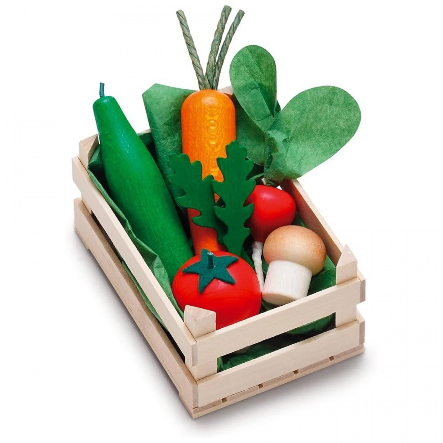 Une petite cagette contenant des légumes en bois. Idéal pour jouer à la dînette et compléter son étalage.