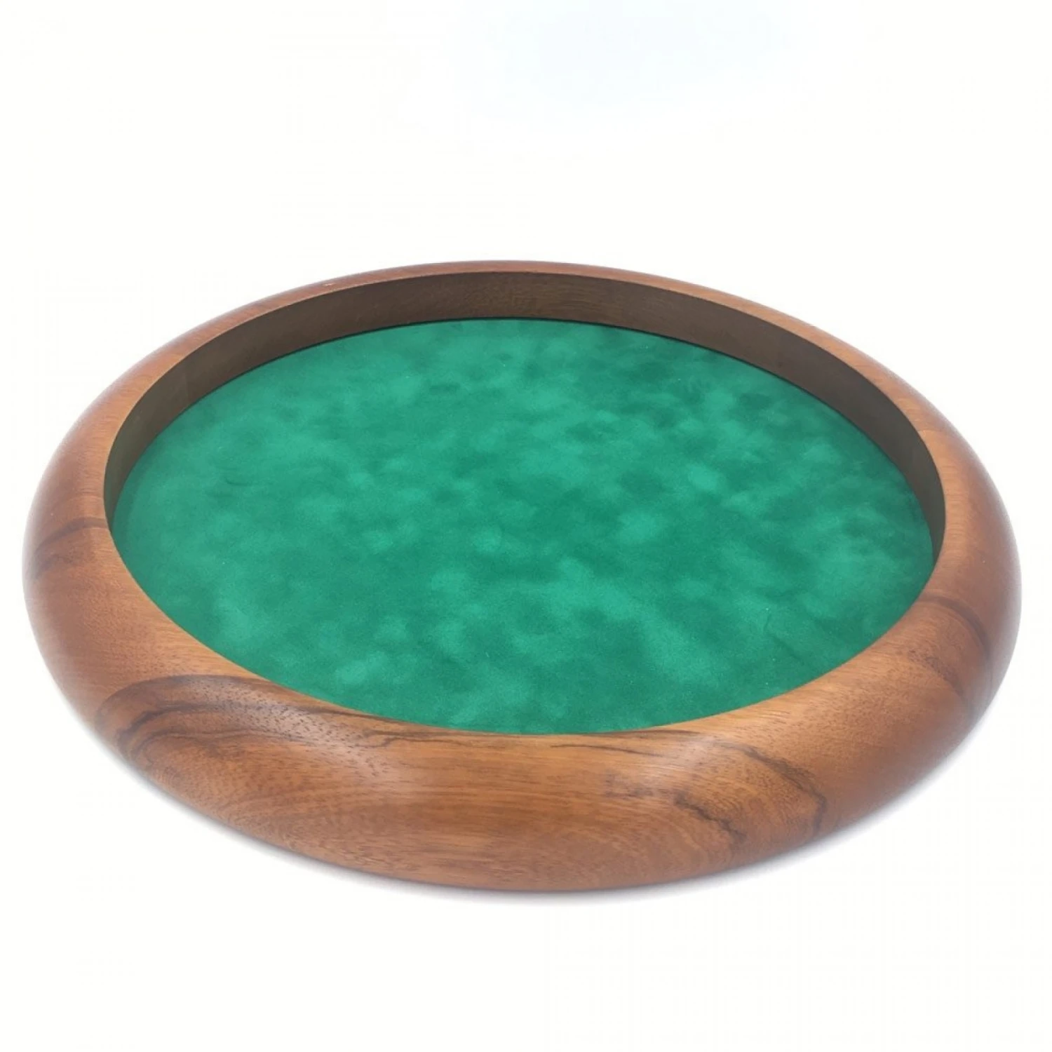 Une piste de dés ronde en bois de Fraké, mesurant 35 cm de diamètre et 4 cm de hauteur. Piste en feutrine verte.