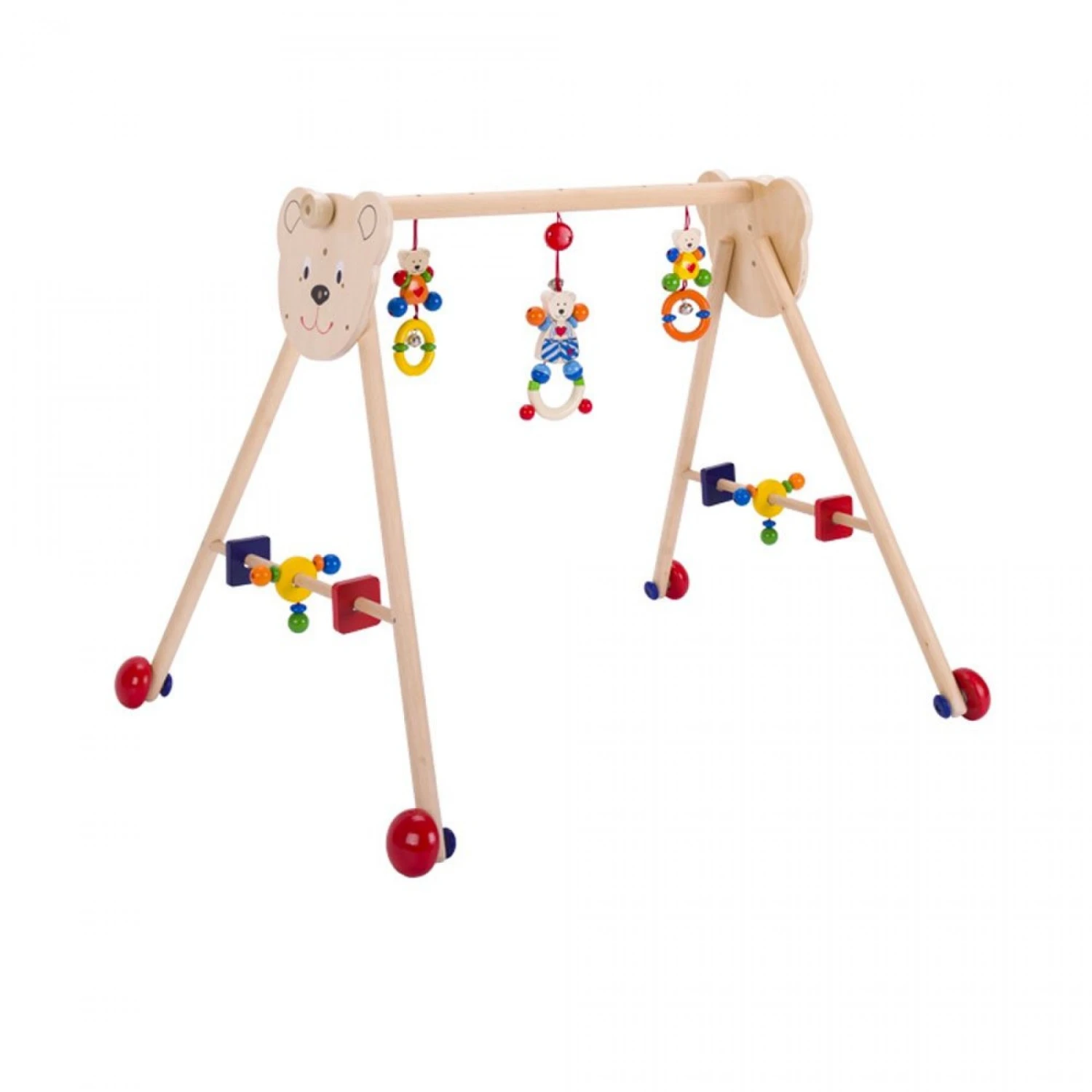 Un joli portique en bois pour éveiller bébé au monde qui l’entoure. Les couleurs vives attireront son regard.