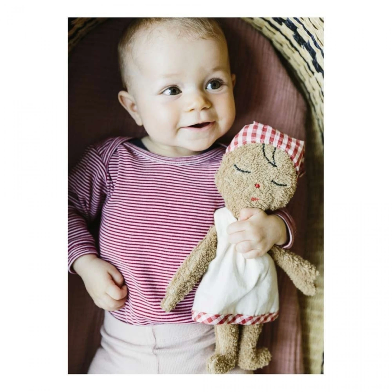 Une poupée de chiffon confectionnée en coton biologique. Cette petite poupée, très agréable au toucher, stimulera l’éveil des sens de bébé. Une première poupée en coton biologique idéale pour bébé.