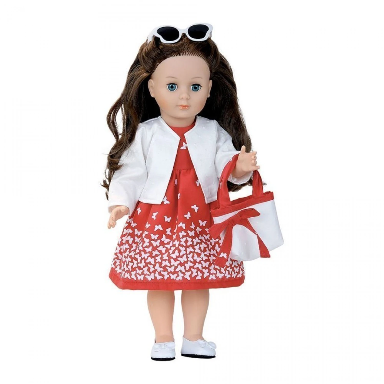 *Vêtements : robe avec « papillons » rouge, veste, sac, chaussures blanches, lunettes