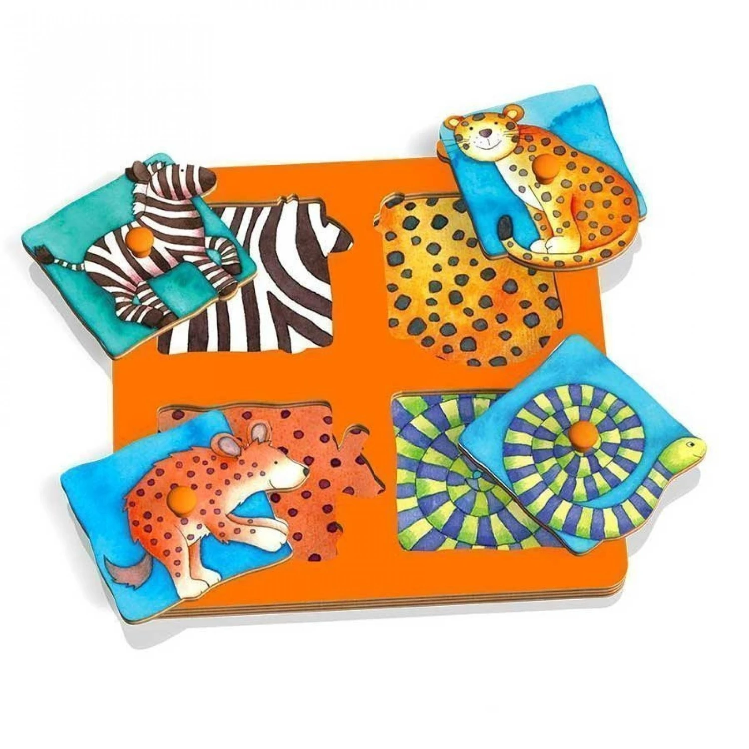 Un puzzle à encastrement comprenant 4 formes à encastrer sur le thème de la savane. Retrouvez le pelage de la hyène, du zèbre, du tigre et du serpent et placez-les correctement afin de reconstituer le puzzle. Un jeu en bois stimulant le développement de la motricité fine et la coordination.