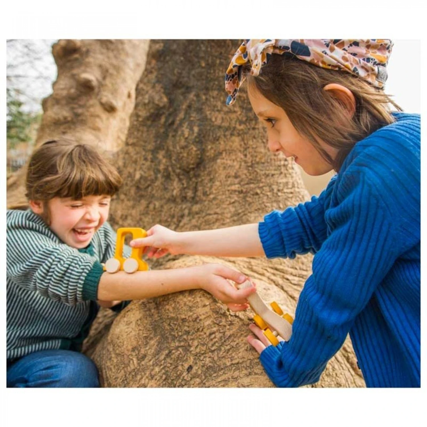 Ce bel ensemble de véhicules en bois est fabriqué à la main à partir de bois certifié FSC et peint avec des peintures écologiques. L’emballage en carton est également conçu comme un support de jeu à part entière.