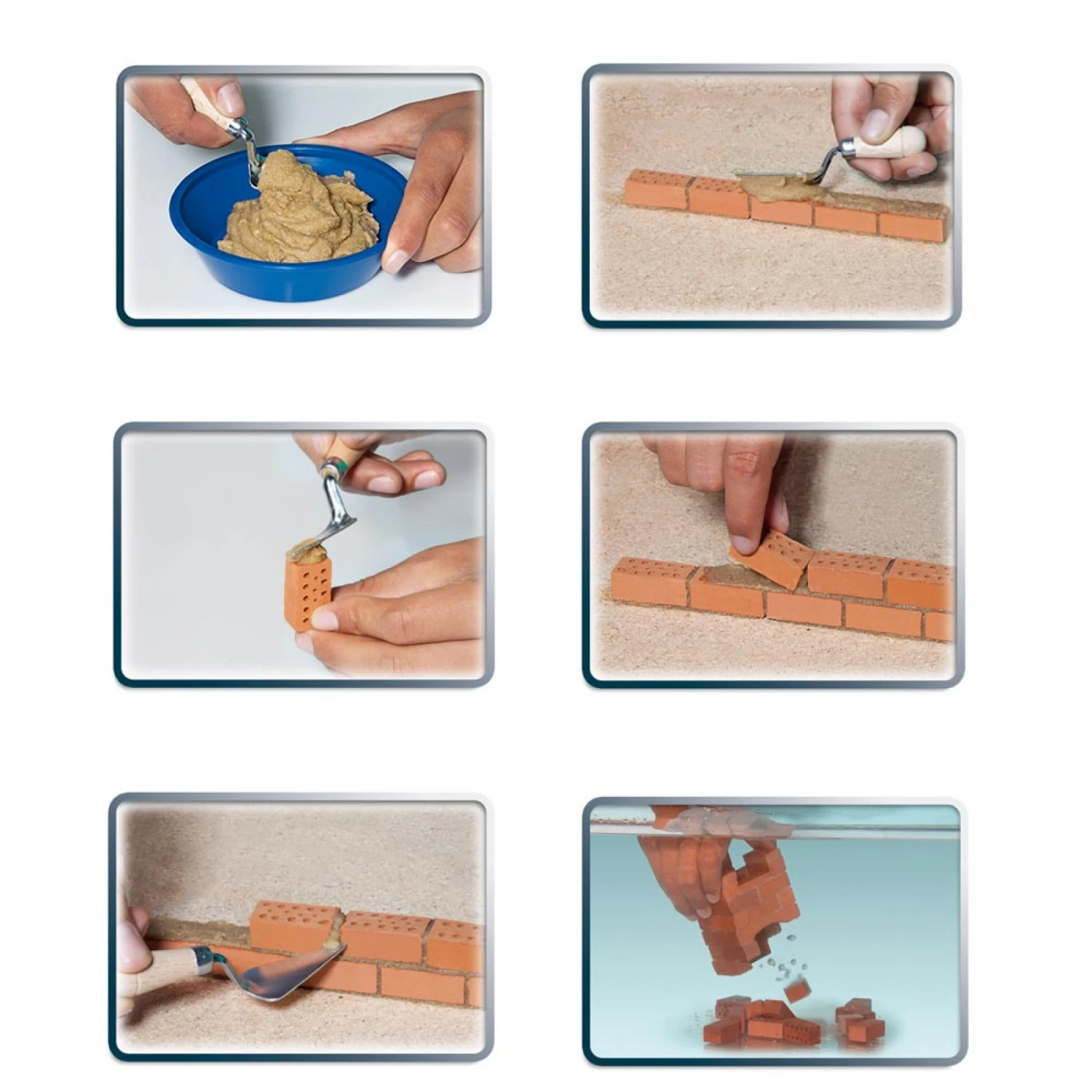 Un set idéal pour des animations collectives avec 8 enfants. Un jeu de construction permettant de maîtriser l’art de la maçonnerie en assemblant les petites briques d’argile avec du ciment. Cet assemblage est très stable et l’effet est vraiment très proche de la réalité. Une fois la construction réalisée, les briques sont réutilisables après immersion dans de l’eau, permettant ainsi de réaliser une autre construction.