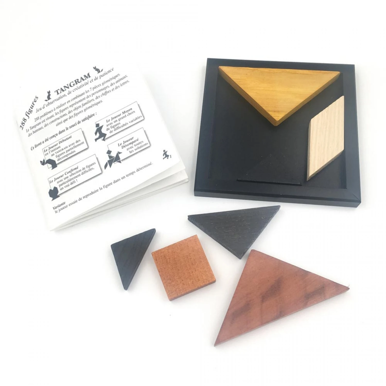 Ce tangram de 7 pièces est adapté pour les enfants à partir de 7 ans. Le but du jeu étant de réaliser la figure géométrique présentée en modèle. En fonction de votre niveau, vous aurez le choix entre 4 niveaux de difficultés. Avec ce jeu de tangram, le joueur confirmé pourra également réaliser de vrais défis.