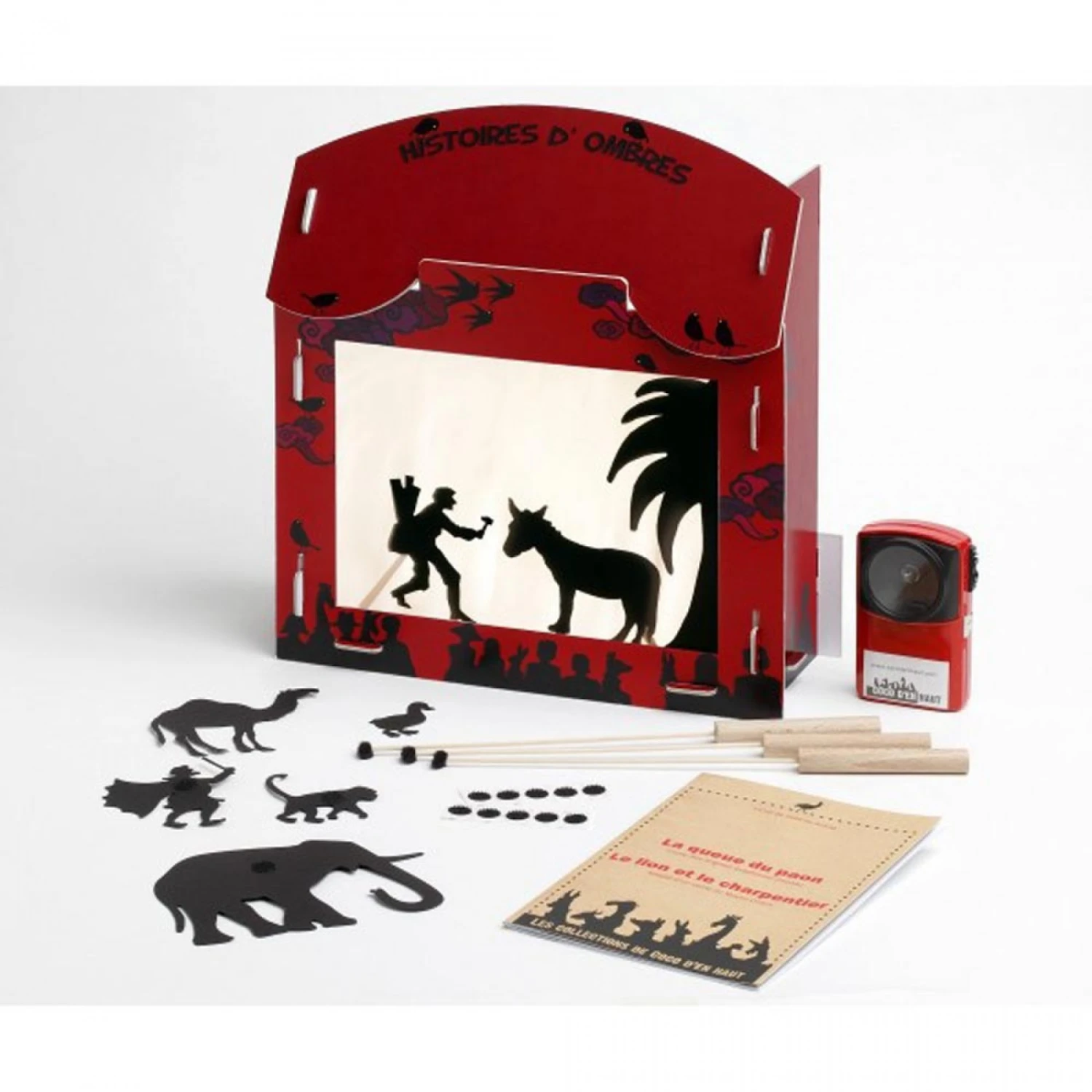 Un théâtre d’ombres chinoises en carton rigide, de fabrication française. Facile à assembler pour une utilisation immédiate et à démonter pour être emporté partout. Avec ce théâtre d’ombres, deux histoires sur le thème des aniamux sont proposées : La queue du paon et Le lion et le charpentier.
