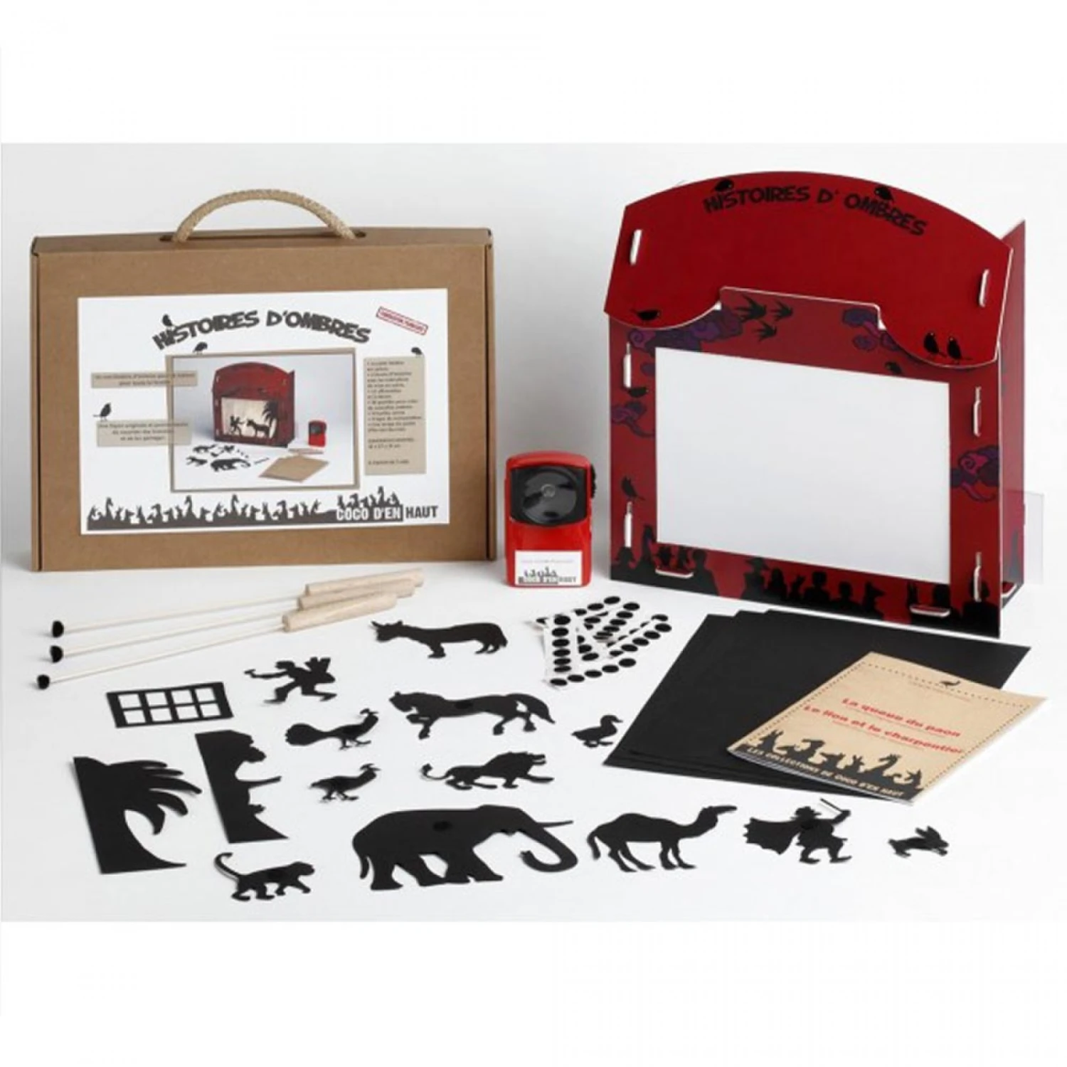 Le tout se range dans une petite valise. Un ingénieux système de manipulation permet aux enfants de faire leurs propres découpages, d’inventer leurs ombres et de les manipuler.