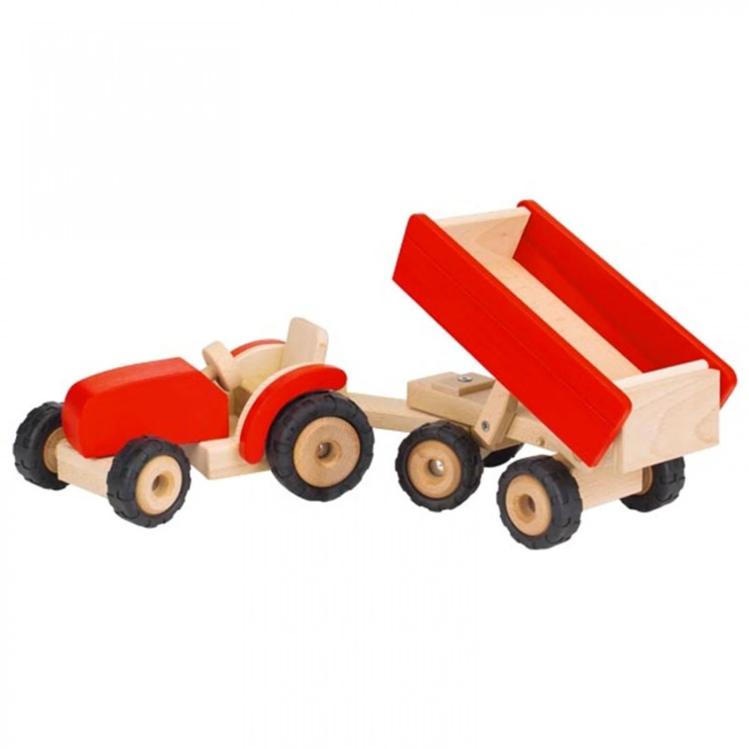 Un tracteur en bois avec sa remorque détachable. Roues avant directionnelles en tournant le volant et remorque basculante.