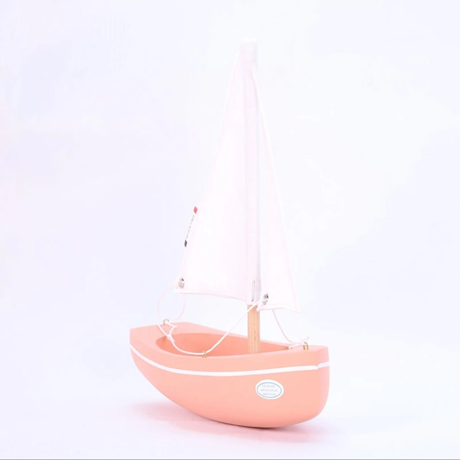 Voiier en bois Le Sloop voile blanche coque rose des Bateaux Tirot