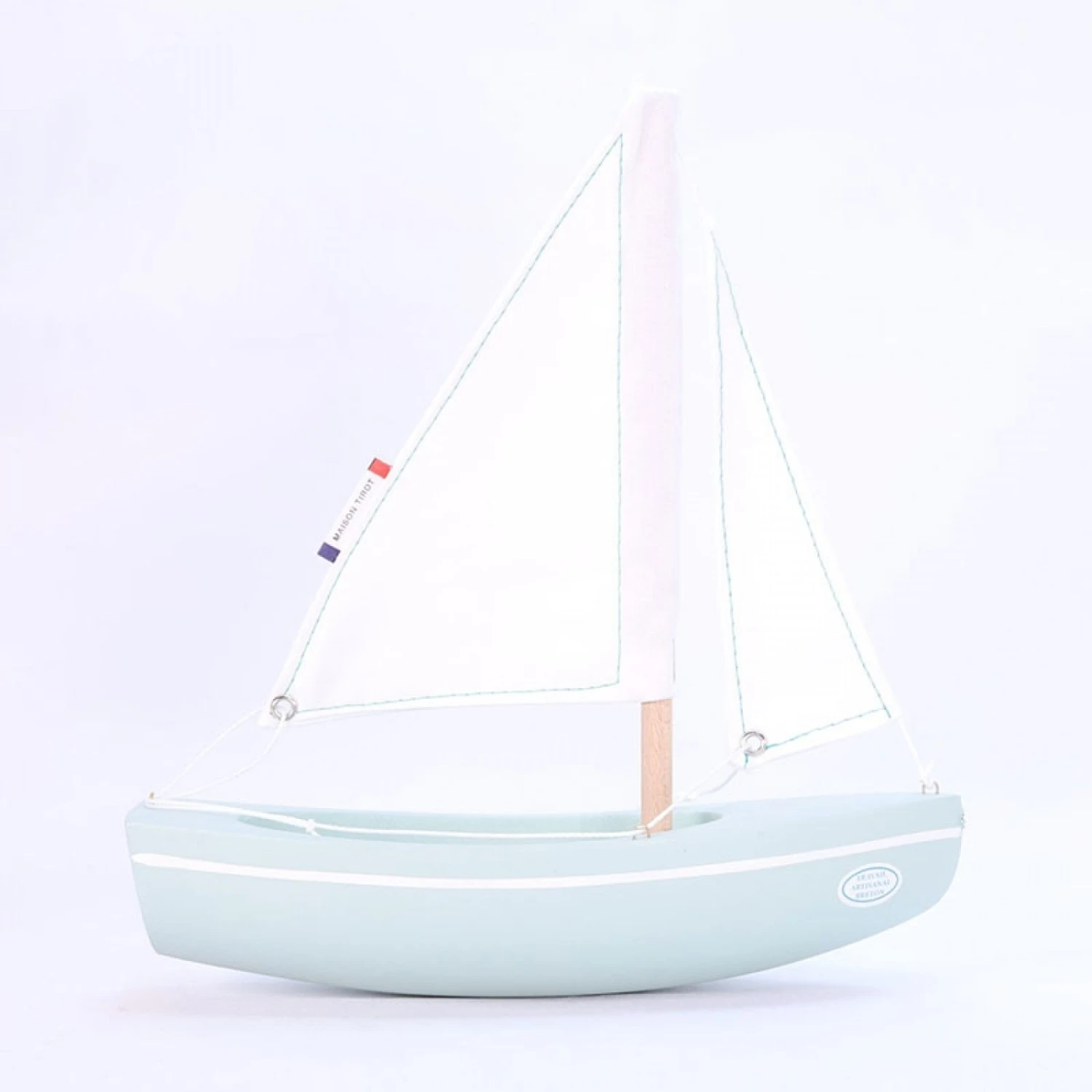 Voiier en bois Le Sloop voile blanche coque vert d’eau des Bateaux Tirot
