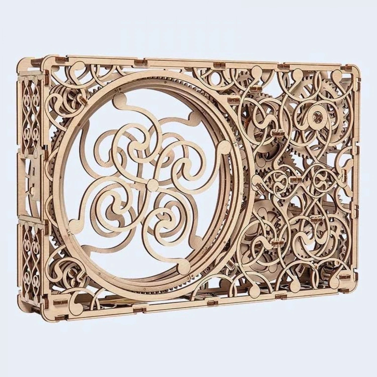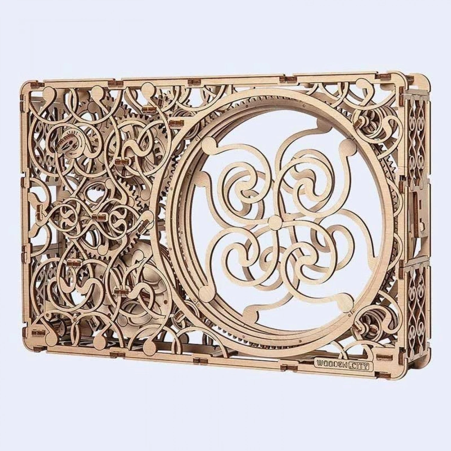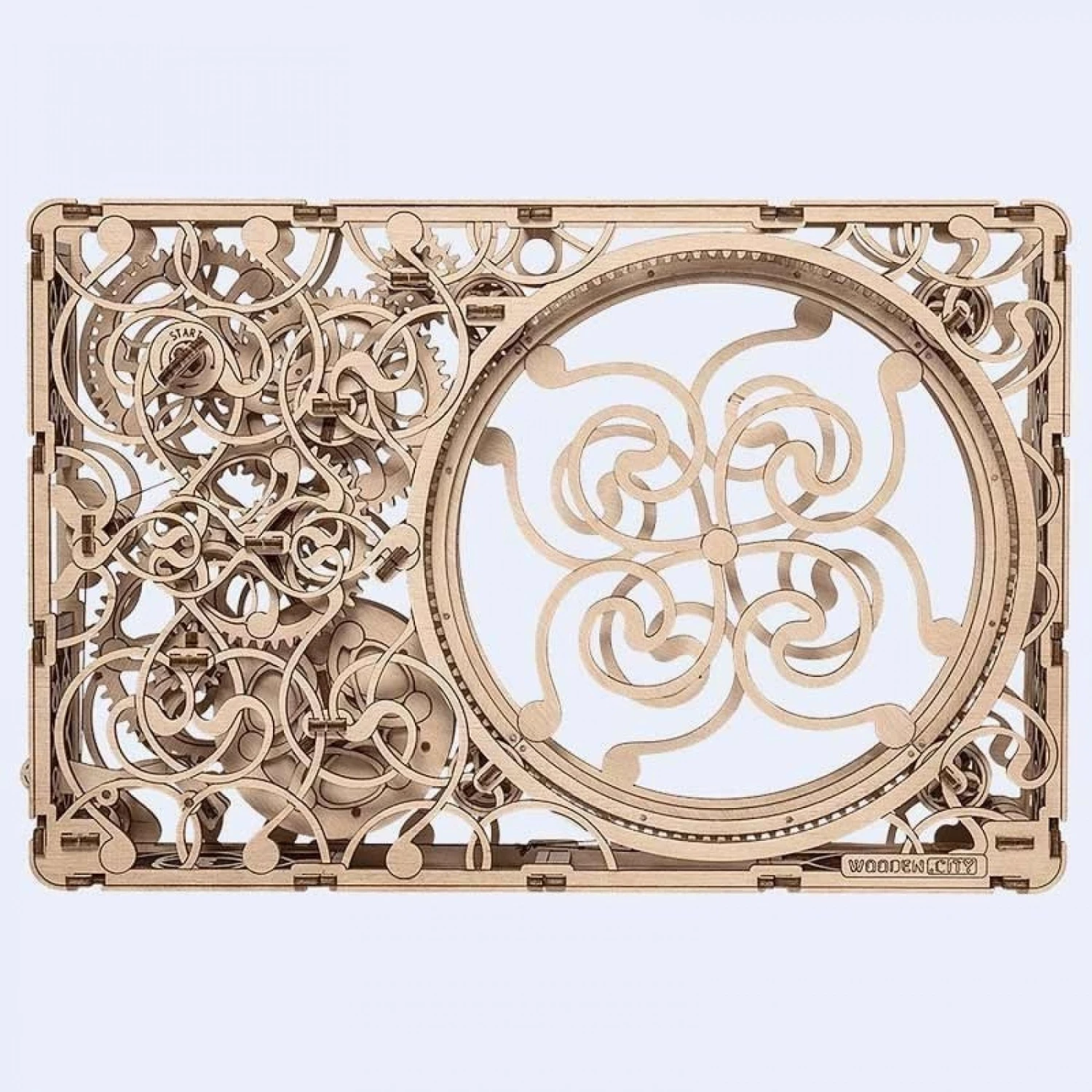 L’image mécanique est une image «vivante»! Vous y verrez la beauté du mouvement mécanique des engrenages créant des motifs complexes et subtils. Toutes les pièces établissent des connexions logiques conformément au calcul mathématique. Cette maquette peut être placée sur une étagère ou accrochée au mur. Elle ne laissera personne indifférent. Quelques tours de clé et le moteur à bande de caoutchouc de votre image mécanique démarre immédiatement. Les engrenages commencent à tourner. L’ensemble tourne sous vos yeux. En utilisant le levier de déclenchement, vous pourrez régler la tension de l’élastique et changer la vitesse de rotation des engrenages. Surprenez vos proches… L’image mécanique attire le regard…Et les enfants adorent tourner la clé.